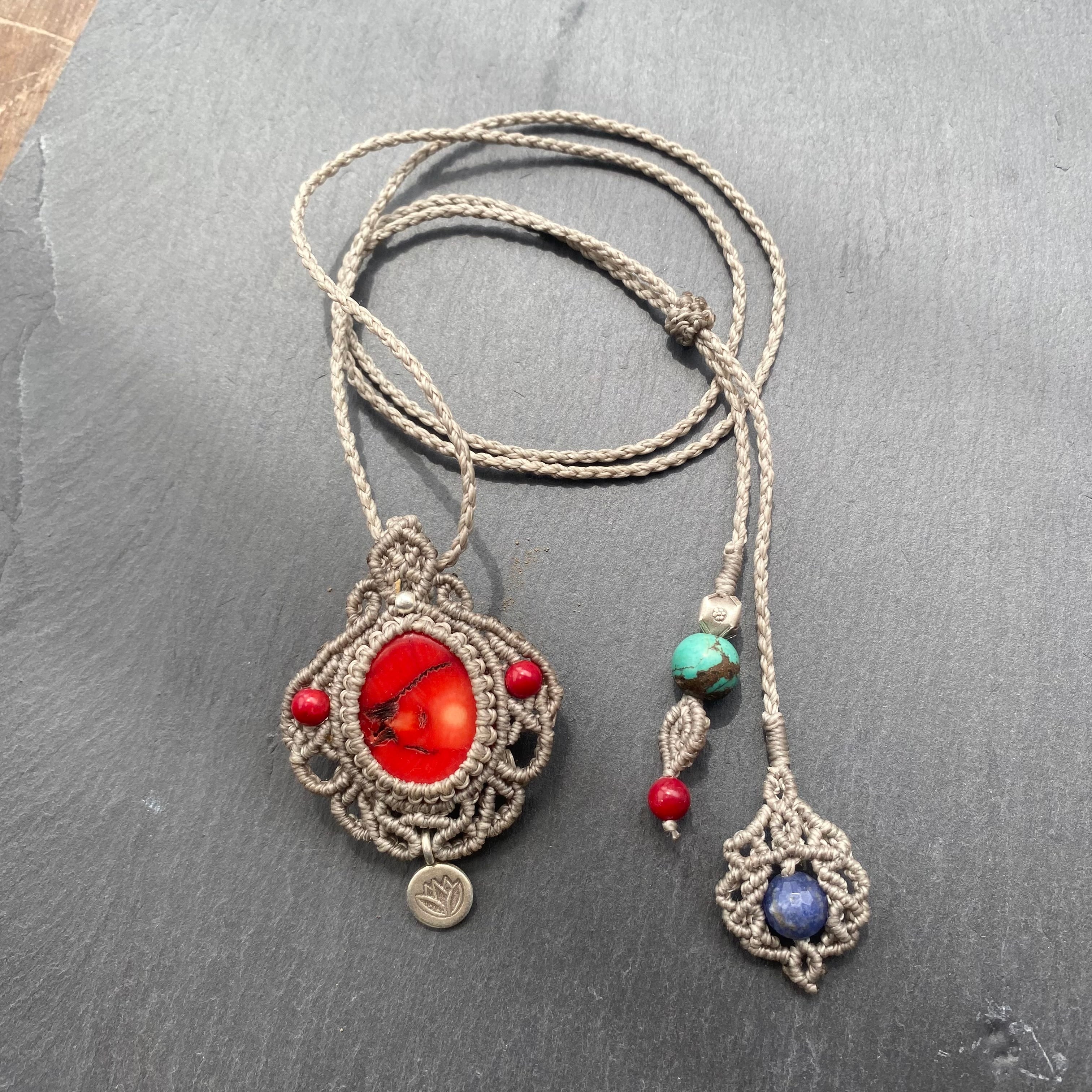 赤い珊瑚の化石と言われ、山から取れる事で名前のついた山珊瑚をマクラメでペンダントを編みました。