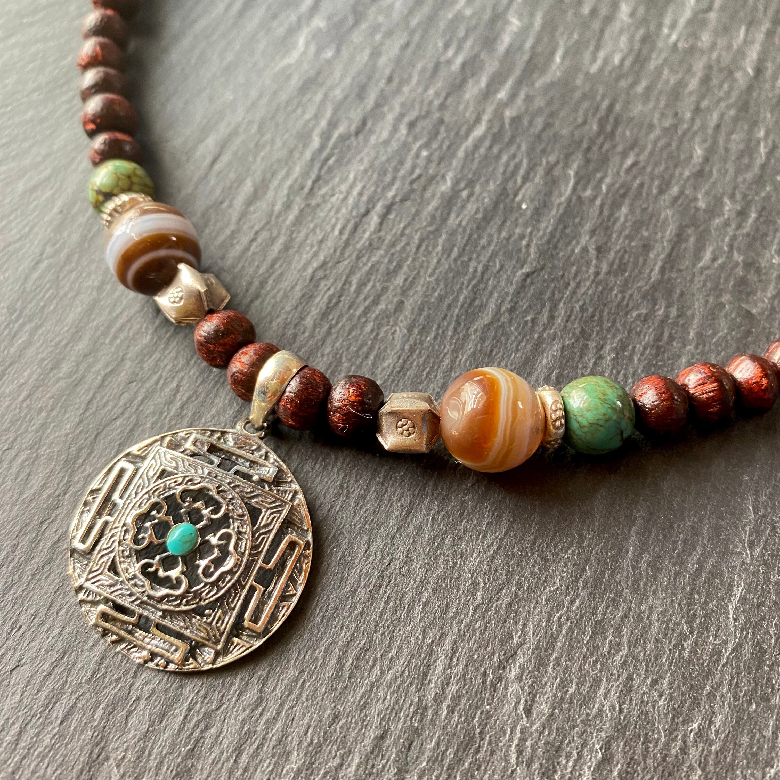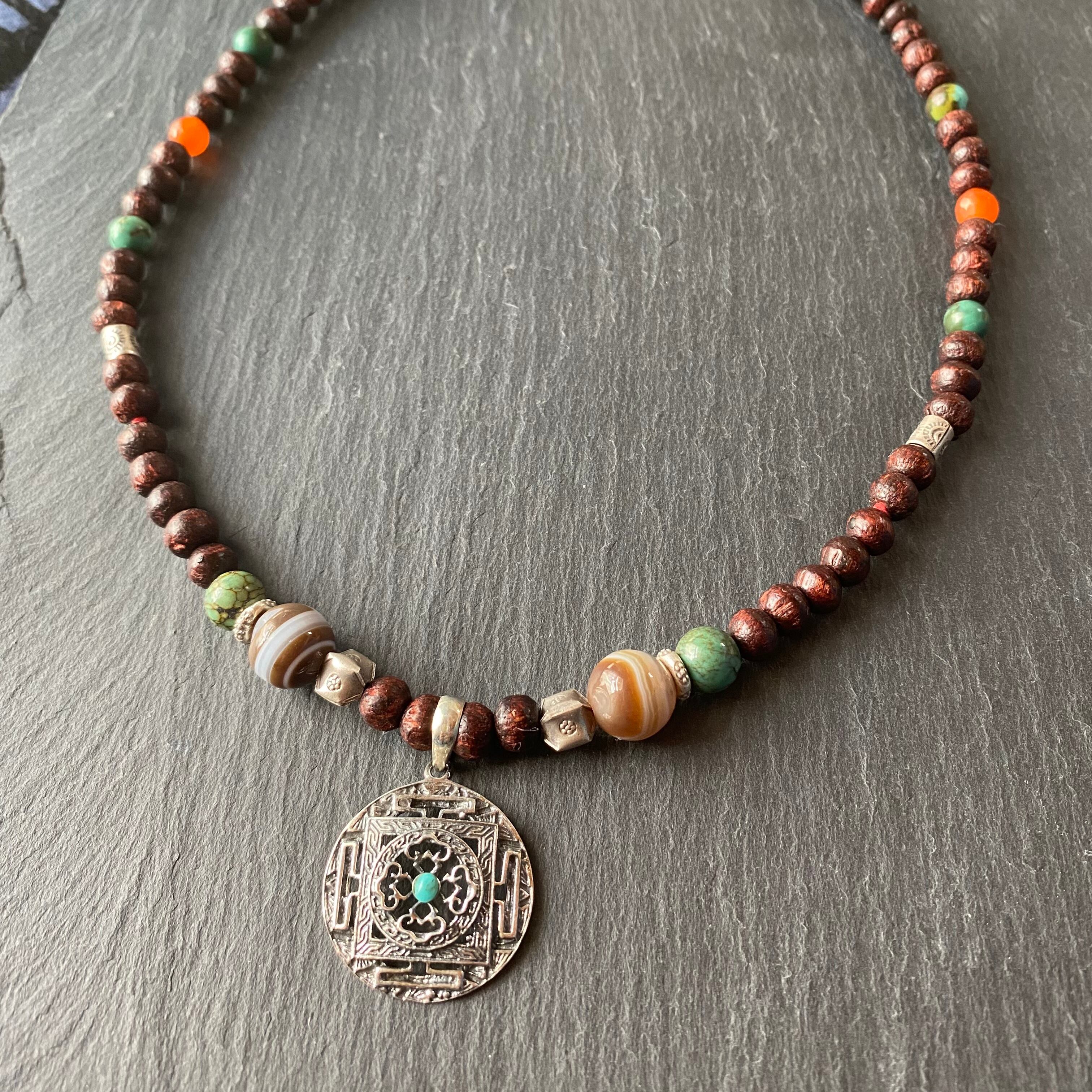 小さなターコイズを中心にした曼荼羅のペンダントトップをローズウッドの数珠とターコイズ、ボツワナアゲート、カーネリアン、カレンシルバー ビーズでネックレスに仕上げました。